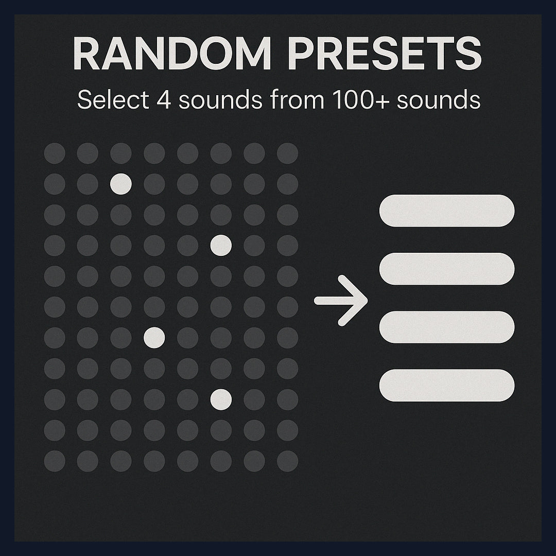 With every !Random preset (we have 9 currently), the plugin loads 4 sounds from an internal pool of 100+ sounds, keys, pads, bells, leads , and inserts them in the preset.