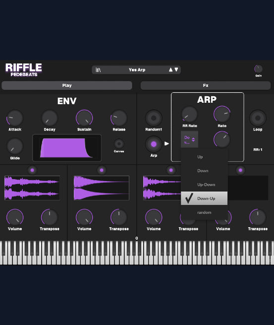 RIFFLE’s arpeggiator isn’t just a basic up-and-down pattern machine, it’s synced with the multi-key engine to create melodies that feel alive.